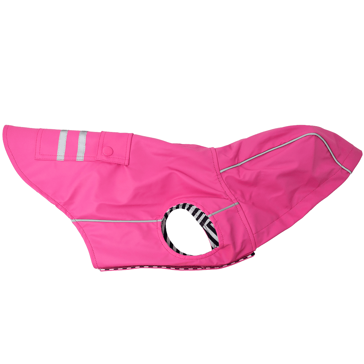 Our Slicker raincoats will have your pup happily splashing through puddles. Made of durable PU material, these raincoats are fun as well as functional. They feature a fashionable striped lining to keep your dog cozy and dry. Other features include a handy pocket on the back for keys or other small items and reflective striping on the pocket and hood to make sure your pup is noticeable, even in low light. These raincoats have a leash hole at the neck and an extra-wide closure along the belly to give your pup some room to grow.